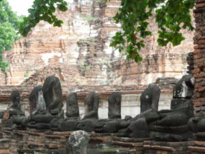 14世紀 タイ アユタヤ遺跡 ワットプラ マハラタート 多くの仏像の首がビルマ軍の侵攻によりはねられている ところどころ黒焦げている 仏塔も倒壊 かつては黄金の仏塔が立っていた