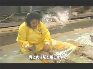 解体中 赤黒い肉から湯気がモクモクと立っている