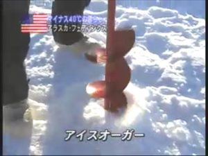 アイスフィッシング 地面の氷にドリルで穴をあけてから釣りを楽しむ 銀鮭などが釣れる