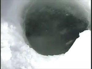 ワカサギ釣りのように地面の厚さ1メートルの氷にドリルで穴をあけてタラバガニを釣る