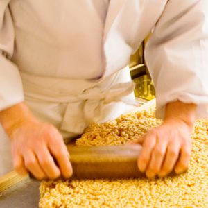 水飴とお米が均等に混じったところで四角い木箱の中へ入れて行きます。さらに厚さが均等になるようによく伸ばして行きます。