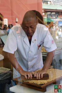 しかし浅草の土産物売り場ではその涼しい天気に負けない涼しい顔をしたイケメン兄さんが雷おこしの実演販売をやってました。