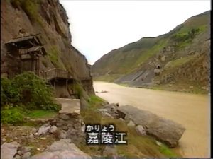 長江の支流 断崖に杭を打ちその上に作られた参道