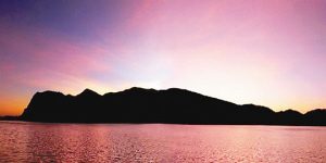 湖の向こうには美人が横になっているような形をした岩がある
