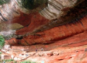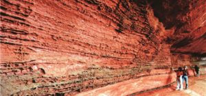 直角に切り立った赤岩を落ちる滝