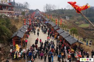 山の斜面に多数の古い民家他立ち並ぶ 入場料100元 酒がふるまわれショーが行われる
