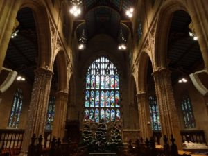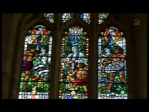 ステンドグラスにアボリジニ(原住民)にキリストの布教活動を行っている絵が描かれている