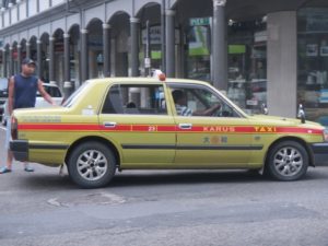 車は日本と同じ左側通行 日本の中古タクシーが会社名入りのまま走っている