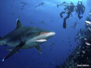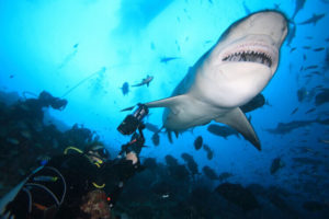 マグロの頭を餌にサメの餌付けが週に3回 行われている 命がけのダイビングではサメの捕食をまじかに見ることが出来る