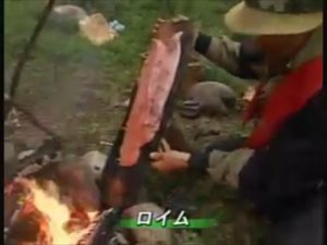 おろしたサーモンは木の板に張り付け燻(いぶし)焼きにする ロイムと言う調理法