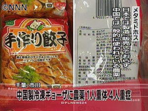 中国で製造した冷凍餃子(輸出品)に農薬が混ざっており それを食べた 日本人が食中毒を起こした。