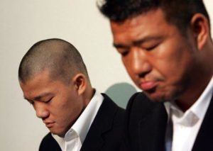 試合後 亀田に投げ技を指示したセコンドの亀田(親父)はライセンス剥奪の処分を受けた 亀田長男が亀田家を代表し頭を丸め謝罪した。