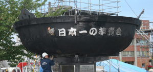そうですそこに用意されたのはクレーンで吊るされた芋煮用の巨大鍋でした。その大きさはなんと直径6メートル重さは実に3.2トンもあるそうです