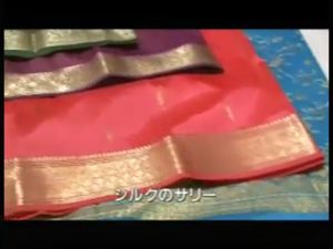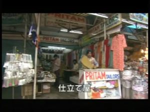 仕立て屋さんのお店で布を選んでサリーのしたて シルクの布などがある