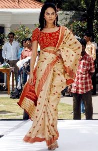 サリーの着方は腰のところで何度も布を巻き付け最後に上半身のところで布をまとめる