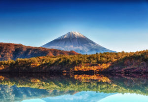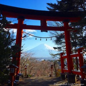 吉田市 鳥居の下に富士山が見える景色 温泉