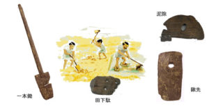 また弥生時代に入ると土木工事の技術が向上し 森を切り開いたり水路が造られたりし稲作が本格化する