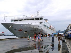 それにしても巨大ダムの外壁と見間違うほど大きな旅客船でした。散歩のあと早めの夕食を済ませフェリーターミナルへと向かいました。