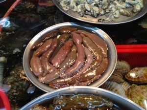 ふと足元を見るとそこには生きのいい鮮魚が〃バタバタ〃と跳ねてました。その後ろでは店のアジュマ(おばさん)がホースを片手に魚に水を撒(ま)いてました。