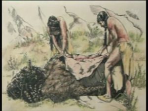 先住民たちはバイソンの群れを追い込みとらえる狩りを行っていた