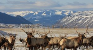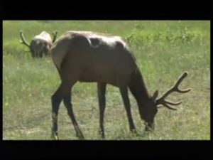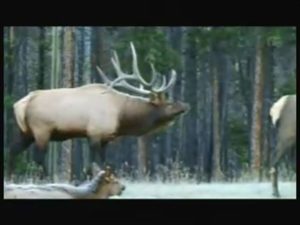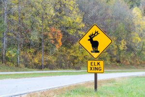 エルクの群れ アスファルトの道路を塞ぐように立っている ヘラジカ(ムース)に次いで大きい