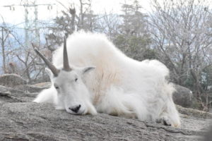 シロイワヤギはロブソン(カナディアンロッキーの最高峰)のシンボルで崖を上る能力に優れている