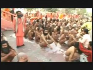修行僧はサドゥーと言いい雄たけびを上げながら行進する 多くのサドゥーが一斉にガンジス川に飛び込む