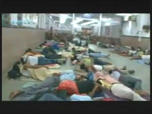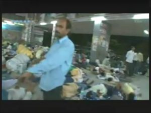 (バラナシ駅) 夜 列車は4時間遅れでバラナシに到着 列車を下りると駅では多くの人が床に毛布を引き寝ている