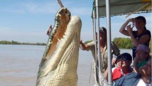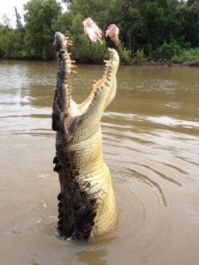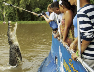 観光船から鶏肉を吊るし餌に食いつくジャンピング クロコダイルが人気