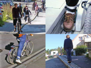 自分の足に三角の鉄をひっかけ バランスをとるのが難しい