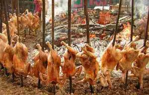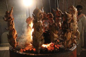 パキスタンの焼き鳥は豪快に鶏一匹丸ごと ほうきの棒のような串に刺して焼きます。