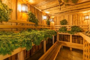 バーニャ(サウナ)葉付きの枝で体をたたく健康法