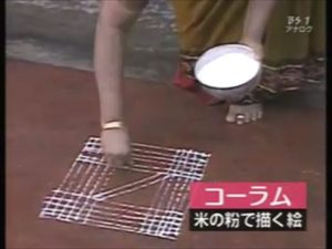 朝一番に行う仕事は家の前で白い米粉を使い曼荼羅(まんだら)と言う幾何学模様の絵を描く