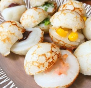 (飲食)カノムクロック 人気の焼き菓子 タコ焼き器を使用 プルンとした菓子 ベトナムの宮廷料理にも同じようなものがあった