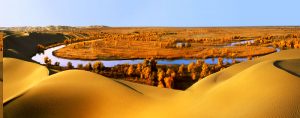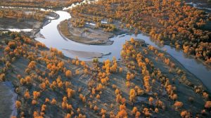 ウイグルを東西にくねくねと蛇行しながら流れる 川岸から200メートル離れたところに川の水がある