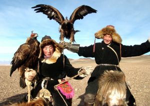 タカを使って狩りをする タカを飼いならす いたずら防止のため普段は目隠しをしている カザフ族の多くはムスリム 道中万年雪が残る