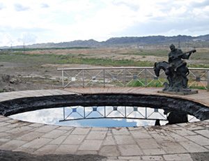 山のふもとには石油の黒い池とサイラム老人が小さな馬に腰かけて演奏している銅像がある