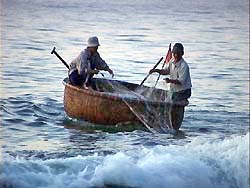 〇クアベー魚港 丸いざる船 船底には防水のため牛の糞が塗られていてベトベトしている 今はコールターンが塗られている(中部ホイアンにもあり)