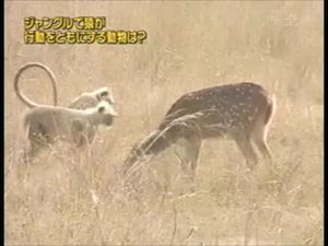 森では猿と鹿(チタール)が協力し合いお互いの天敵でもあるトラの接近を知らせ合っている