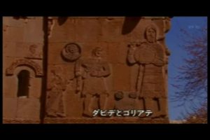 のちにイスラエル王となるダビディが巨人ゴリアテと戦う様子が彫られている