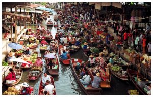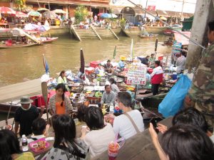 〇ダムヌンサドゥアク 水上マーケット 船の上では芋虫 タガメなど昆虫料理も売っている