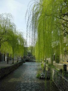 一筋の川沿いに背の高い柳(やなぎ)の木が静かに立ってました。その柳の木からは多くの枝と葉が垂れ下がるように〃すらり〃真っすぐに伸びてました。