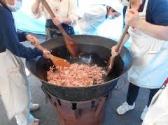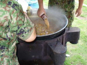 するとそこでは先程の隊員たちが船のオールの様な長細い子爵(ししゃく)を使って一生懸命〃ぐつぐつ〃と煮える大鍋の中をかき混ぜていました。