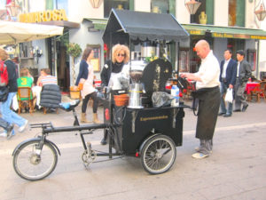 ベビーカー付きやサイドカー付き コーヒーを入れる機械のついた自転車など様々な自転車が街を走っている