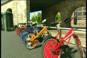 市内に駐輪所が100か所以上ある 借りるとき最初に機械の中に一つコイン(約440円)を入れ 返す時に戻ってくる