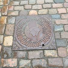 町のどこかにアンデルセンが帽子をかぶったシルエットが描かれたマンホールがある
