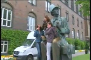 みんながアンデルセンの膝の上に腰かけ記念撮影をするのでアンデルセンの膝のところだけこすれて黄色くてかてかになっている