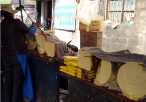 周りにはヤクのバターの塊が売られている バターは祭壇の灯りの燃料として使われる 祭壇近くはバターのにおいがきつい