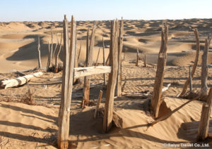 現在は砂漠に無数の木の柱が突き刺さったニヤ遺跡となって存在している(中国 ウイグル南部)
