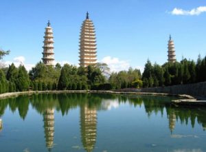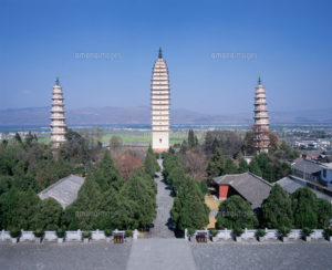 823年 崇聖寺三塔(すうせいじ さんとう)(雲南 大理) 南詔国の王によって建てられた高さ69メートルの3本からなる仏塔 塔の周りにあった寺院は唐により破壊された